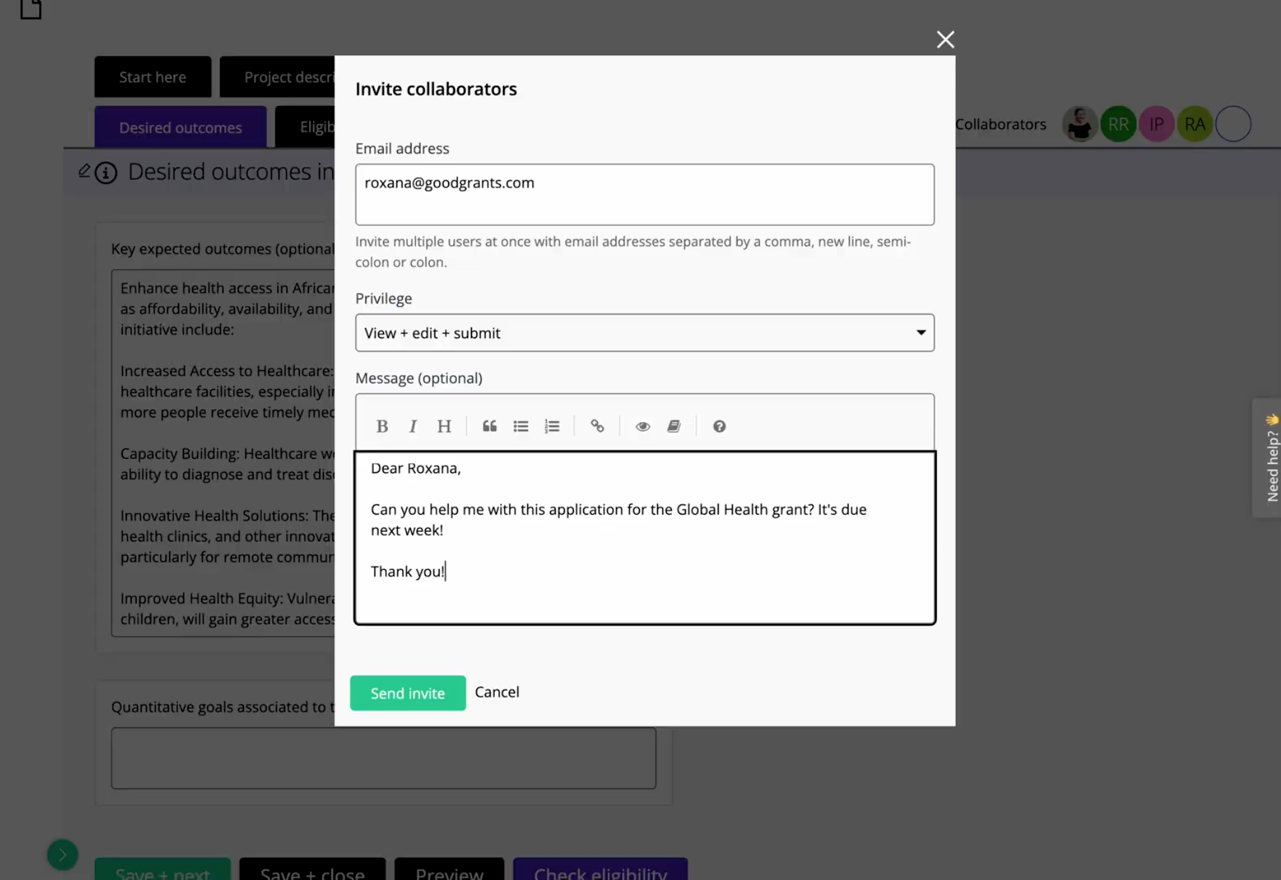 Um die Zusammenarbeit bei Einreichungen in Good Grants zu aktivieren, können Fördermittelmanager einfach ein Kontrollkästchen in den Formulareinstellungen der Bewerbung ankreuzen. Dies ermöglicht es den Bewerbenden dann, andere einzuladen, ihnen beim Ausfüllen des Formulars zu helfen.